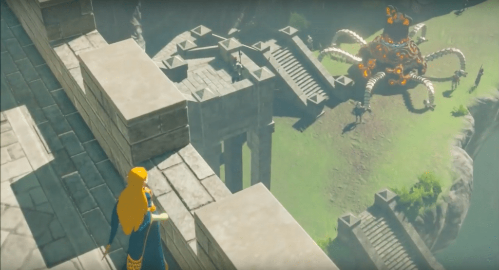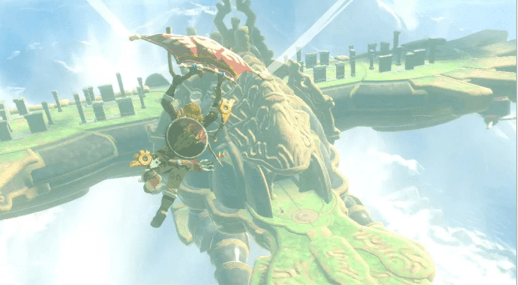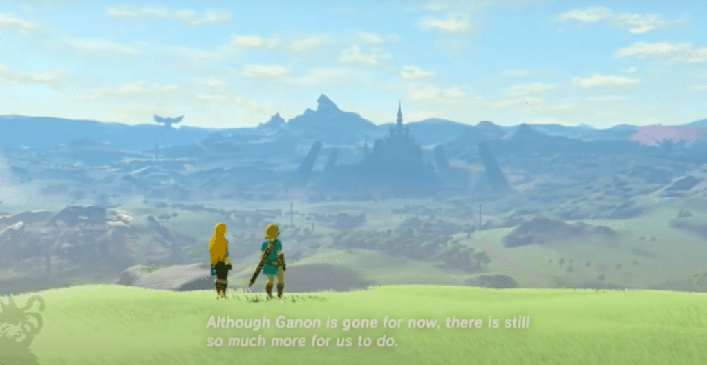 BotW reprend ainsi à son compte la notion de fin de la civilisation et de la fin de l’homme pour en donner une interprétation dans l’univers de Zelda. S’adressant à la fois aux jeunes joueurs et aux adultes, BotW conserve donc cette double lecture entre une histoire classique d’un jeu Zelda et une parabole sur la civilisation et son rapport à la technologie. BotW parvient par ailleurs à ancrer cette histoire dans ses mécaniques de jeu : vaincre les gardiens nécessite des mécaniques différentes de celles utilisées pour vaincre les monstres d’une part, et, d’autre part, libérer les créatures divines des ombres de Ganon permet de créer une sensation de majesté en créant des donjons originaux, non sans rappeler le classique Shadow of the Colossus par moment.