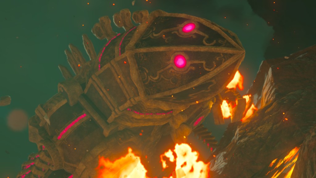 Le véritable ennemi dans BotW n’est pas tant Ganon, qui reste omniprésent mais est très peu personnifié : les yeux rouges et la fumée noire, la malice, indiquent son emprise sur un ennemi de Link. Mais la forme que prend l’ennemi est généralement technologique : gardien ou créature divine notamment. Cette nouvelle forme de Ganon permet de renouveller les mécaniques de jeu en créant des ennemis nouveaux, mais aussi de nourrir ce discours sur la technologie par le gameplay.