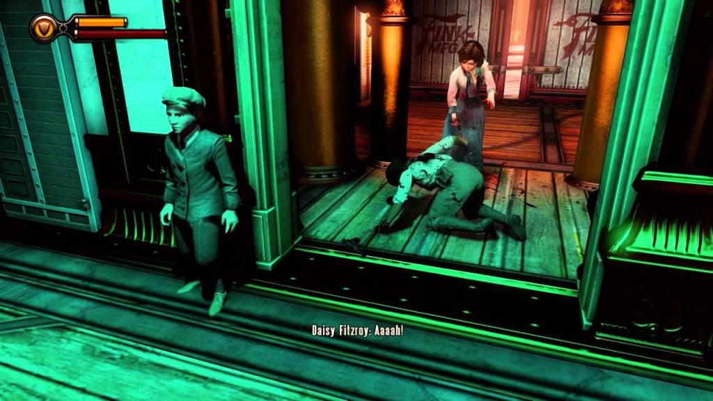Bioshock n’adopte pas de position claire sur le sujet (est-ce que la question du libre arbitre n’est pas au fond stérile ?), mais insiste à plusieurs reprises sur ce qu’il est nécessaire de réaliser pour permettre le déroulement de l’histoire, comme si on se libérait d’une contrainte pour se retrouver confronté à une autre. La liberté serait alors de choisir la meilleure des contraintes qui s’impose à nous. Par exemple, dans le DLC Tombeau sous-marin, le sicentifique de Rapture Suchong demande à Elisabeth d’utiliser une faille pour retourner à Columbia récupérer un élément pour ses travaux. Elisabeth tombe alors sur une conversation entre Daisy, la révolutionnaire à la tête de la Vox Populi, et les Lutece qui lui expliquent qu’elle doit se faire tuer par Elisabeth pour permettre à celle-ci de passer de « fille à femme » et qu’elle puisse vaincre Comstock. La suite est dans Infinite lorsque Daisy provoque Elisabeth et qu’elle se fait tuer. Elisabeth réfléchit alors à sa condition et se demande si Daisy avait un choix et si elle-même avait vraiment un choix : « Je ne vais jamais y échapper. Exploitant, exploité ». On a donc un parallèle entre la contrainte de la condition sociale et la contrainte de l’histoire qui se déroule. Les évènements appellent d’autres évènements, on se libère de ses chaînes pour d’autres et on accepte certaines chaînes pour se libérer d’autres. Elizabeth pensait faire le choix de tuer Daisy, elle se libérait simplement de Columbia pour se soumettre à l’ordre des choses voulu par les Lutece.